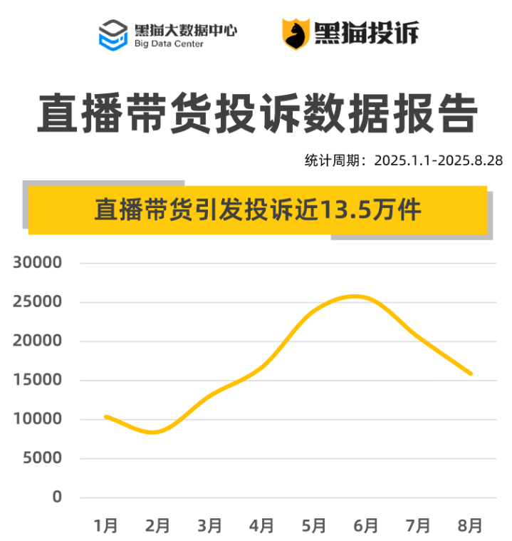 按照黑猫大数据核心发布《曲播带货赞扬数据演讲》,2025年前八月,黑猫赞扬平台累计收到曲播带货相关赞扬近13。5万件,行业问题越来越凸起。
